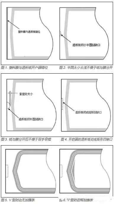 另外,很大一部分醫(yī)用紙塑包裝袋,為了輕松地開啟,開啟處的封邊都選擇了V 型封燙(如圖 5)。這樣雖然滿足方便開啟,但在滅菌時,特別是蒸汽滅菌的情況下,容易出現(xiàn)V 型處爆開現(xiàn)象。為了解決這一現(xiàn)象,在V 型的內(nèi)側(cè)凹處增加了一根加強(qiáng)條(如圖6),更能滿足蒸汽滅菌時的需求。 TEL:13912278158